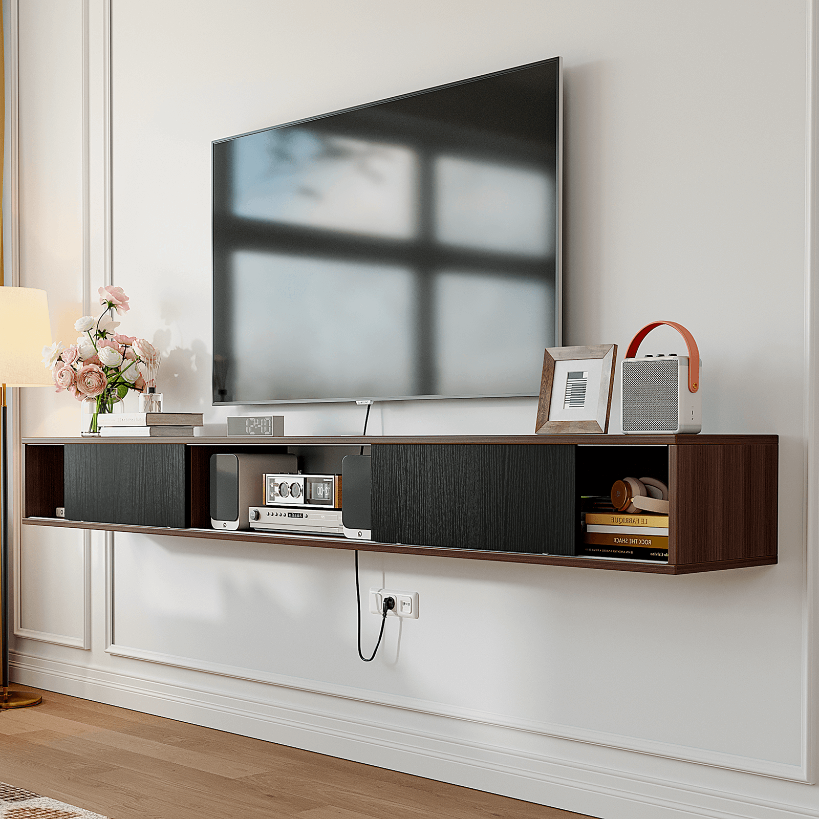Space-Saving Floating Design: By lifting your entertainment setup off the ground, this modern wall mounted TV console not only looks incredible but also makes your room feel larger and is incredibly easy to clean beneath.