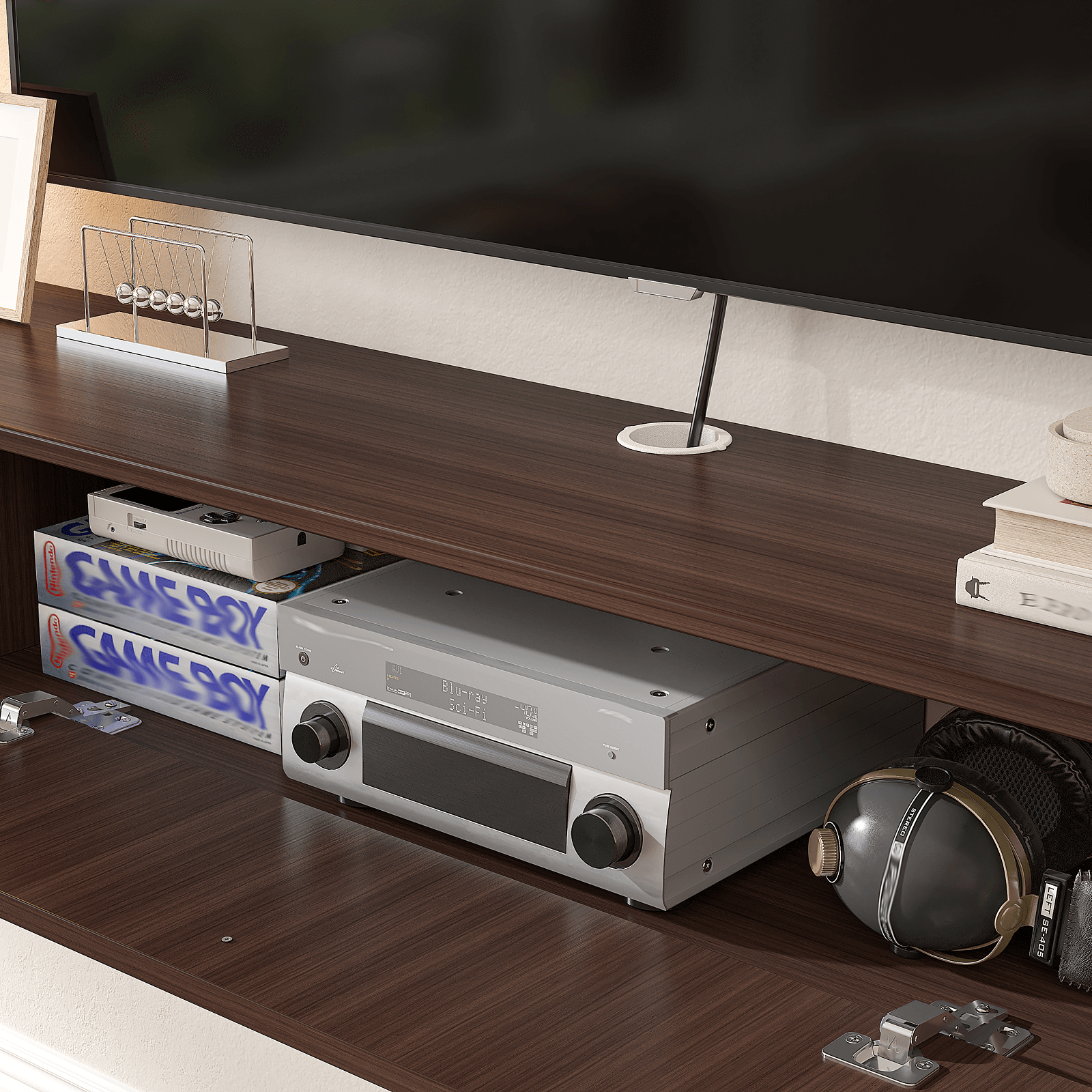 Get the best of both worlds with our versatile storage options. A sleek flip-down door conceals your gaming consoles, routers, and remotes, keeping your space tidy and streamlined. Two adjacent open compartments are perfect for showcasing your favorite decor, books, or media players.
