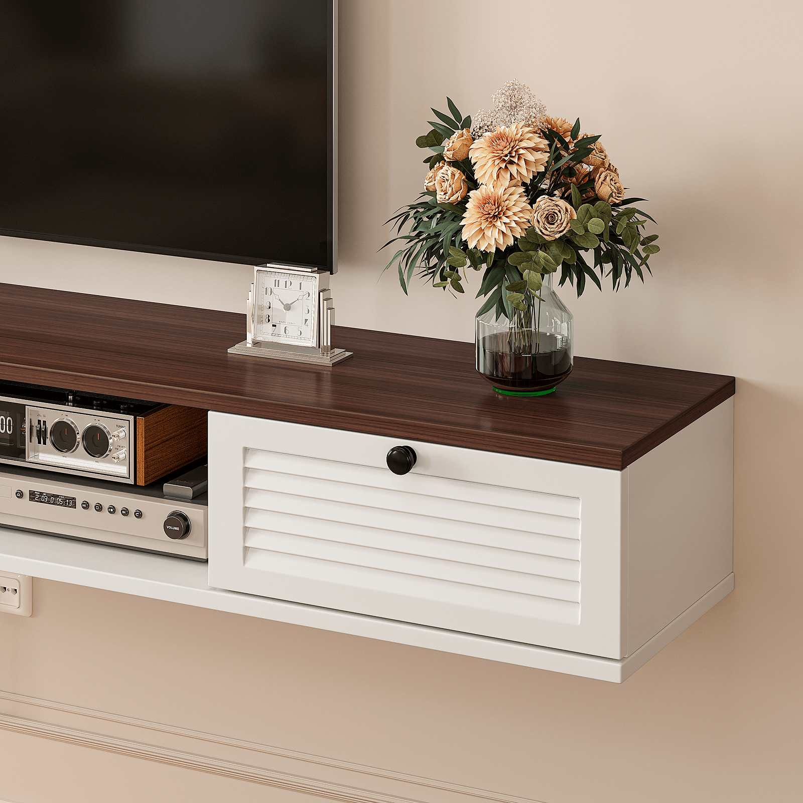 Create a clean, stunning focal point in your entertainment space with this Walden TV Stand in White and walnut. Blending timeless colors with modern design, this “floating” media console mounts directly to your wall, saving valuable floor space and creating an open, airy aesthetic. The design features a crisp white cabinet body perfectly complemented by a rich, warm walnut-colored top panel, offering a sophisticated two-tone look that fits seamlessly with any decor.